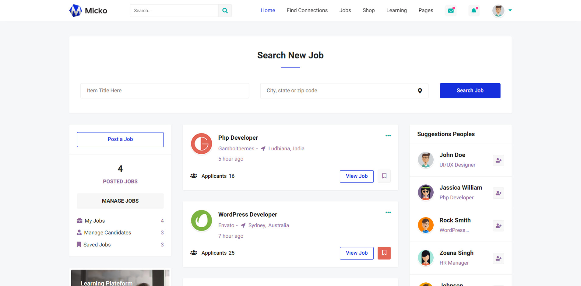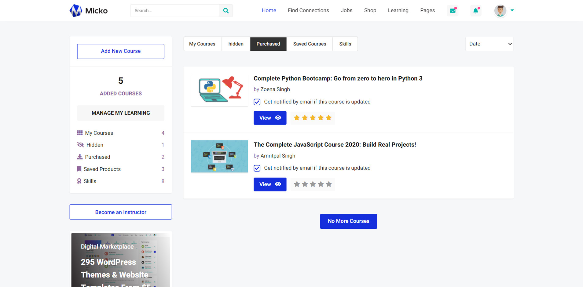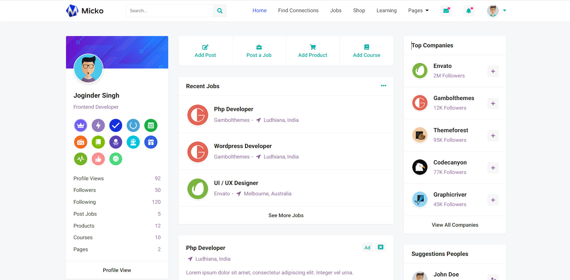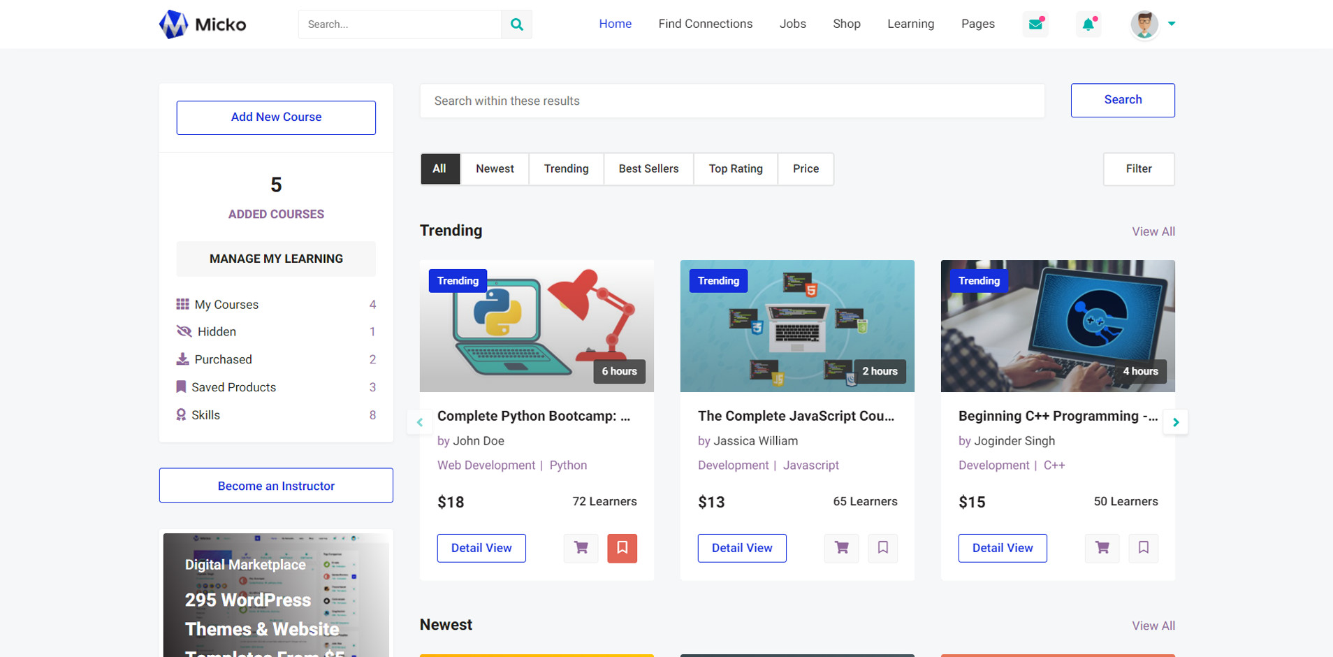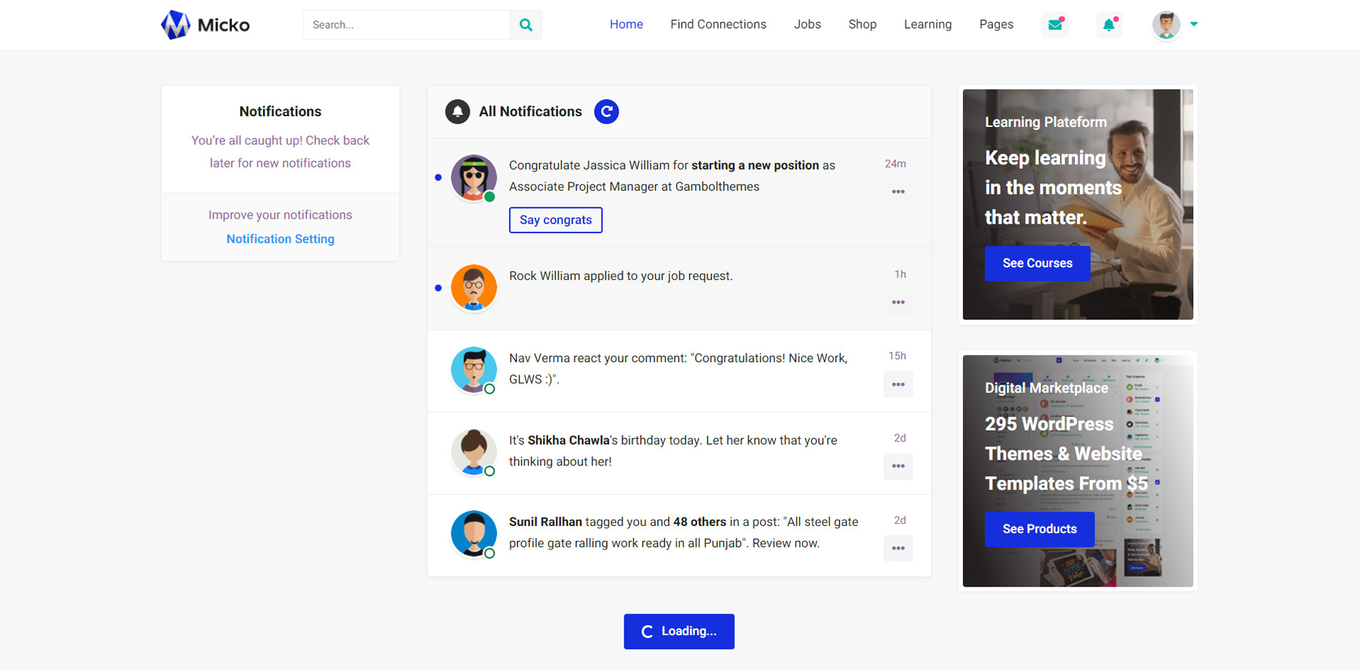 Micko is an all-in-one solution for creating Job Portal, Digital and online education marketplaces with social Nwtworking like Udemy, Skillshare, Coursera, Facebook, Instagram, Envato, Template Monster, Indeed, Monster Jobs etc.